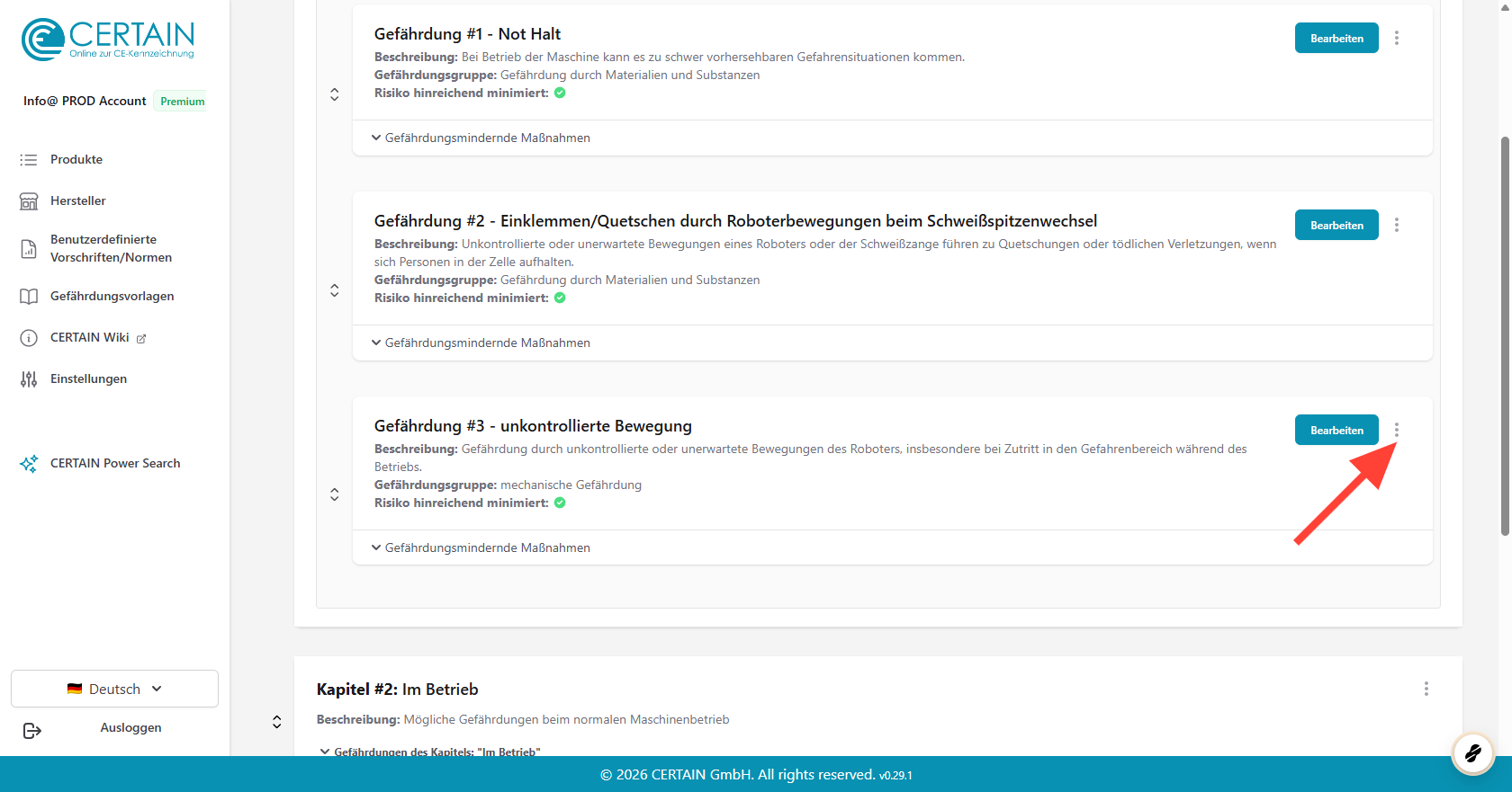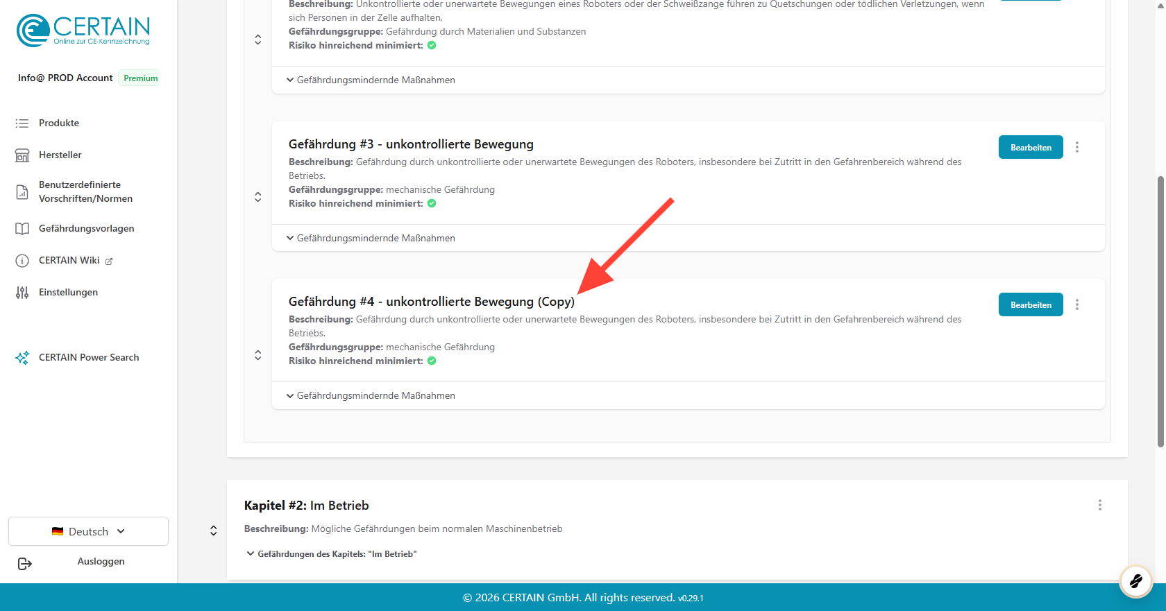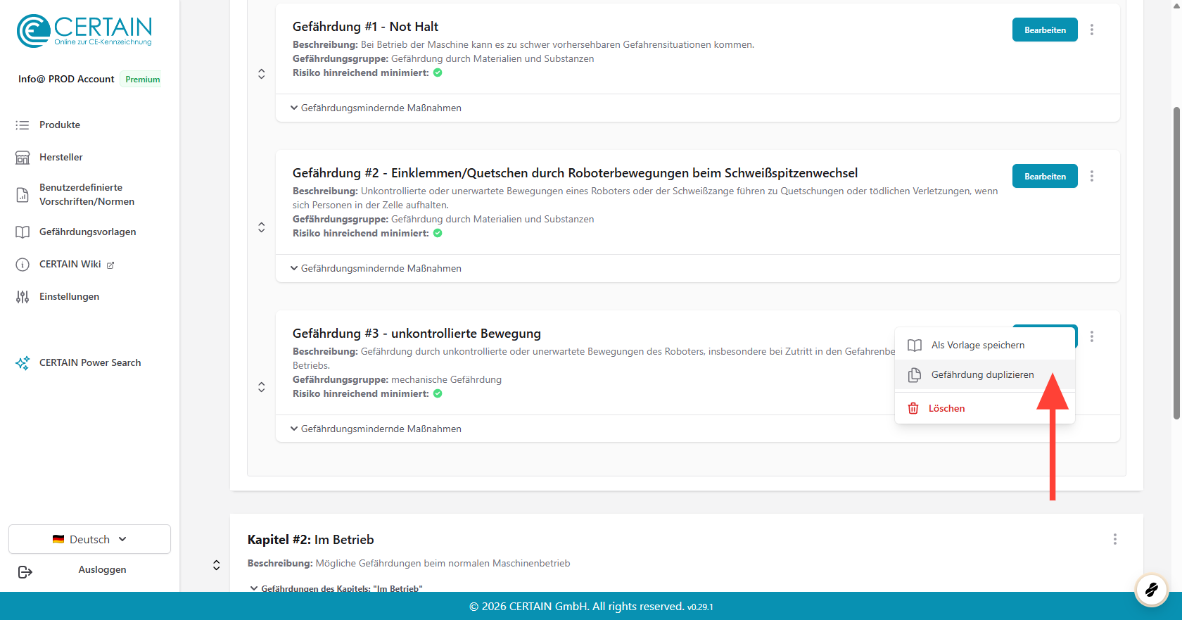 Mit CERTAIN haben Sie die Möglichkeit, Gefährdungen innerhalb einer Risikobewertung zu duplizieren. Wenn für ein Produkt ähnliche Gefährdungen ermittelt wurden, können Sie viel Zeit und Aufwand sparen, indem Sie eine vorhandene Gefährdung kopieren und anschließend nur die Teile bearbeiten, die geändert werden müssen.